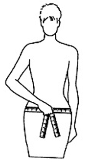 Coloca-se a fita métrica, esticada em volta da parte mais saliente do quadril, somando-se ao número achado 4 cm; divide-se o total da soma por 2; em seguida subtrai-se 10 cm do resultado.